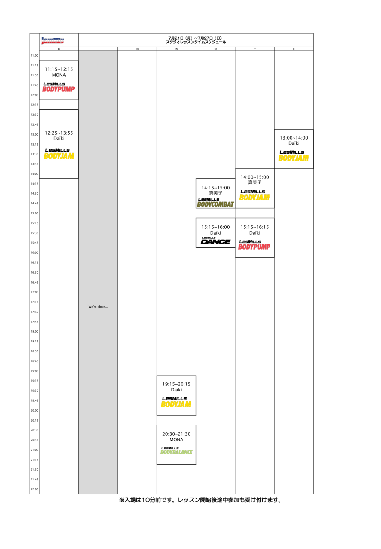 7/21(月)〜 7/27(日) のスタジオスケジュール