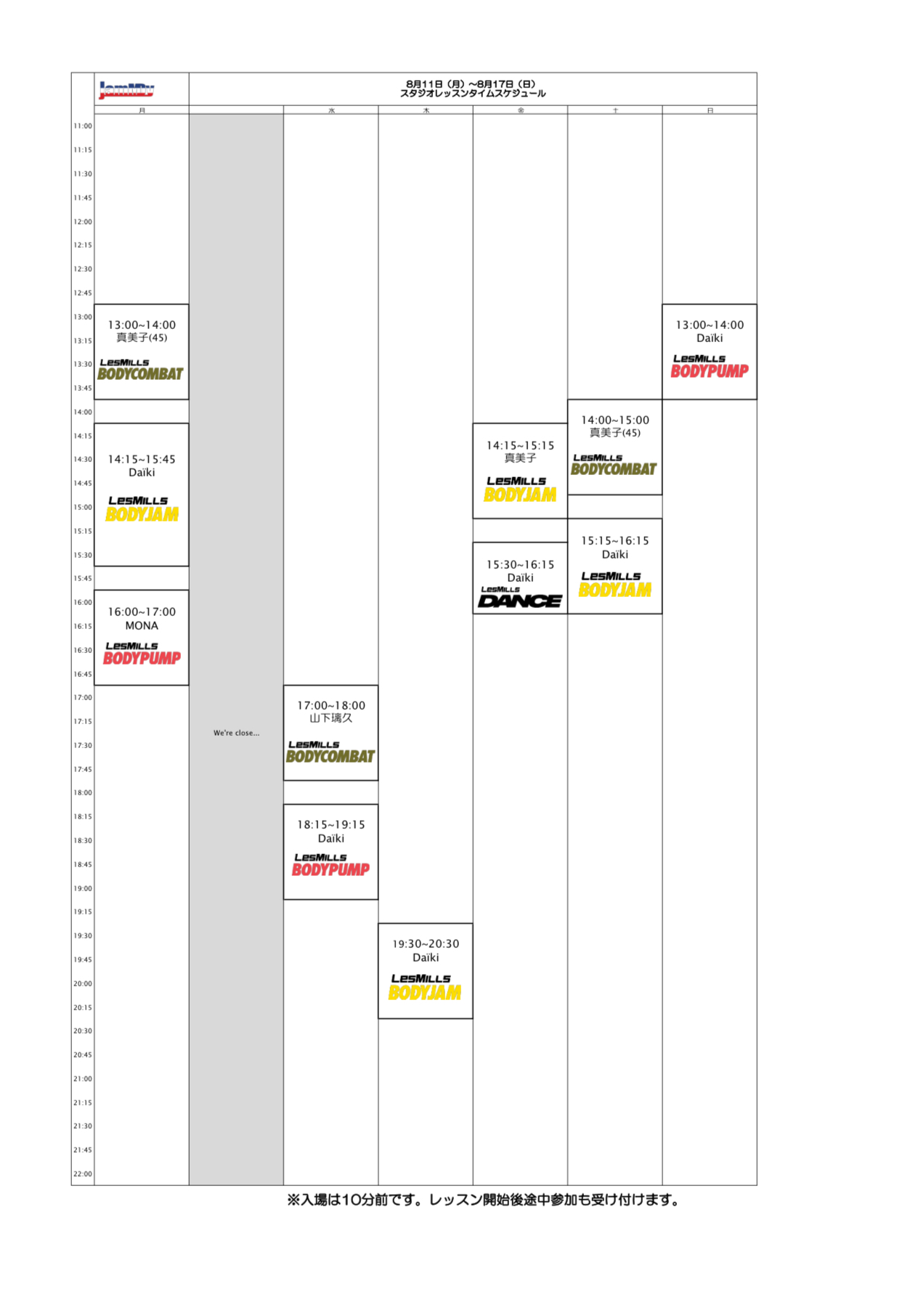 8/11(月)〜 8/17(日) のスタジオスケジュール